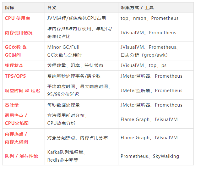 • 性能提升:通过优化垃圾回收策略、合理分配内存,提高业务线程执行效率,降低延迟。• 资源利用率提升:合理的堆、线程和元空间配置能充分利用 CPU 和内存,减少资源浪费。• 稳定性提升:降低 OOM 风险、减少系统崩溃概率,保障压测和生产环境的可靠性。二、JVM 调优核心指标