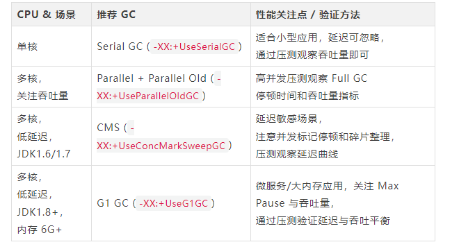 • 观察 TPS/QPS 是否提升• 检查 Minor GC/Full GC 次数和停顿时间说明:内存充足可以减少垃圾回收频率,降低 CPU 占用,提高业务吞吐量5.2 选择合适 GC