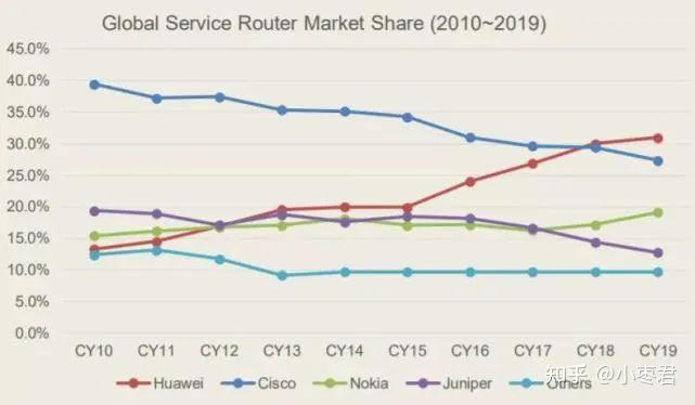 2000年之后,情况变了。Juniper、华为迅速崛起,开始挑战思科的地位。