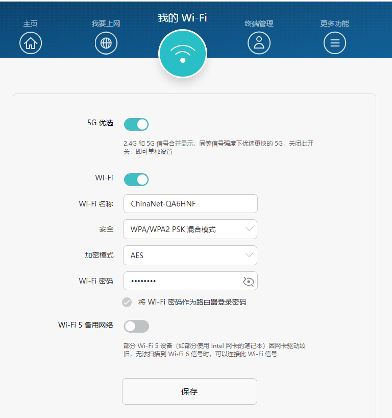 不建议将wifi密码作为管理密码,自己设置后,保存。