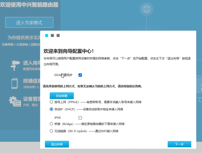 按照下一步流程走完后,再次登录路由器,填写路由器背后的密码登录。记得左上角进入专家模式。