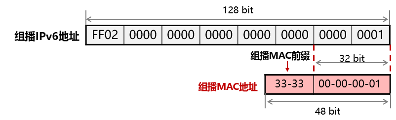 33-33是专门为IPv6组播预留的MAC地址前缀,MAC地址的后32bit从对应的组播IPv6地址的后32bit拷贝而来。