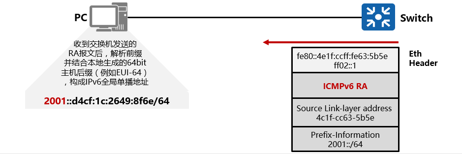 终端收到RA报文,就知道了这个链路的网络号,然后再通过EUI64(稍后有介绍)自动生成接口ID,而接口ID就相当于IPv4中的主机位,现在网络位和主机位都有了,就获得了完整的IPv6地址。