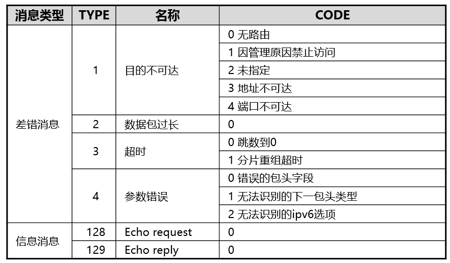 也和IPv4一样,ICMP报文用不同的type+code组合,来表示不同的网络故障