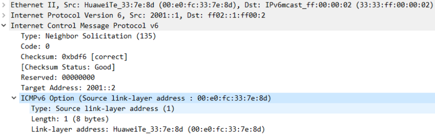 NS报文发送使用组播的方式,报文的目的IPv6地址为被请求的IPv6地址对应的“被请求节点组播地址”,报文的目的MAC为组播MAC。