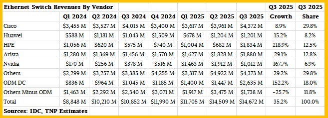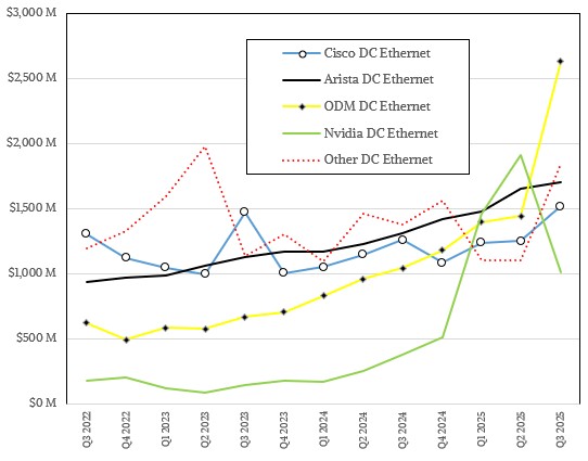 我们将拭目以待英伟达这条绿线在2025年第四季度、2026年第一季度和第二季度的数据公布时的表现如何,但很明显的是,截至2025年第三季度,ODM作为整体在数据中心以太网交换机收入中占据主导份额。在ODM的崛起和英伟达的崛起之间,现有企业——主要是思科、Arista,也许还有华为——正面临压力。但随着压力加大,数据中心以太网市场正在扩张,似乎有足够的空间让所有参与者共同成长。暂时如此。