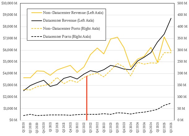 上面的图表和表格涵盖了所有以太网交换,但我们 The Next Platform 关注的数据中心。幸运的是,IDC 仍然将数据中心以太网交换机收入从非数据中心销售中拆分,自 2020 年第一季度新冠疫情爆发以来一直如此。直到 2022 年第二季度,IDC 还向公众公开了数据中心内外的端口数量,但此后停止了。此后,我们一直在尽力估算。数据与端口数量估计之间的界限由下图中的红线显示: