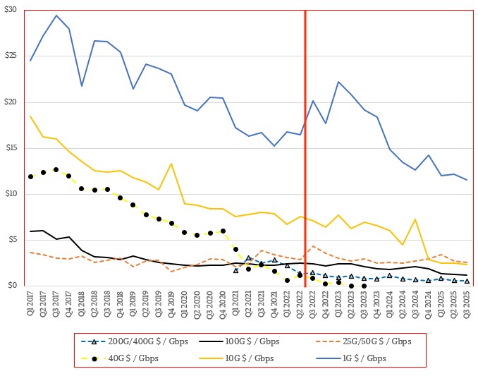 大意是,400 Gb/sec的交换机每比特成本最低,而目前800 Gb/sec设备的比特价格大约有50%的溢价。但100 Gb/sec端口比800 Gb/sec设备贵30%,因为它们基于较老技术,依此类推,甚至1 Gb/sec交换机,按比特计算成本非常高。