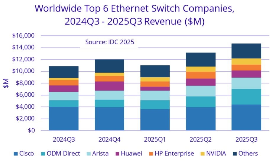在IDC最近一次获得以太网交换和路由数据的第三季度,基于同一以太网协议的交换机销售额同比增长35.2%,达到147亿美元。这是以太网交换机销售的历史新高,甚至比去年第二季度高出1.1%。