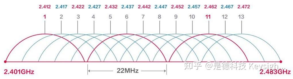 频段进一步划分为较小的信道(Channel)。以2.4GHz频段为例,频率从2.401GHz到2.483GHz,被分为13个信道(2.4G频段一共14个信道,中国只开放前13个信道)。
