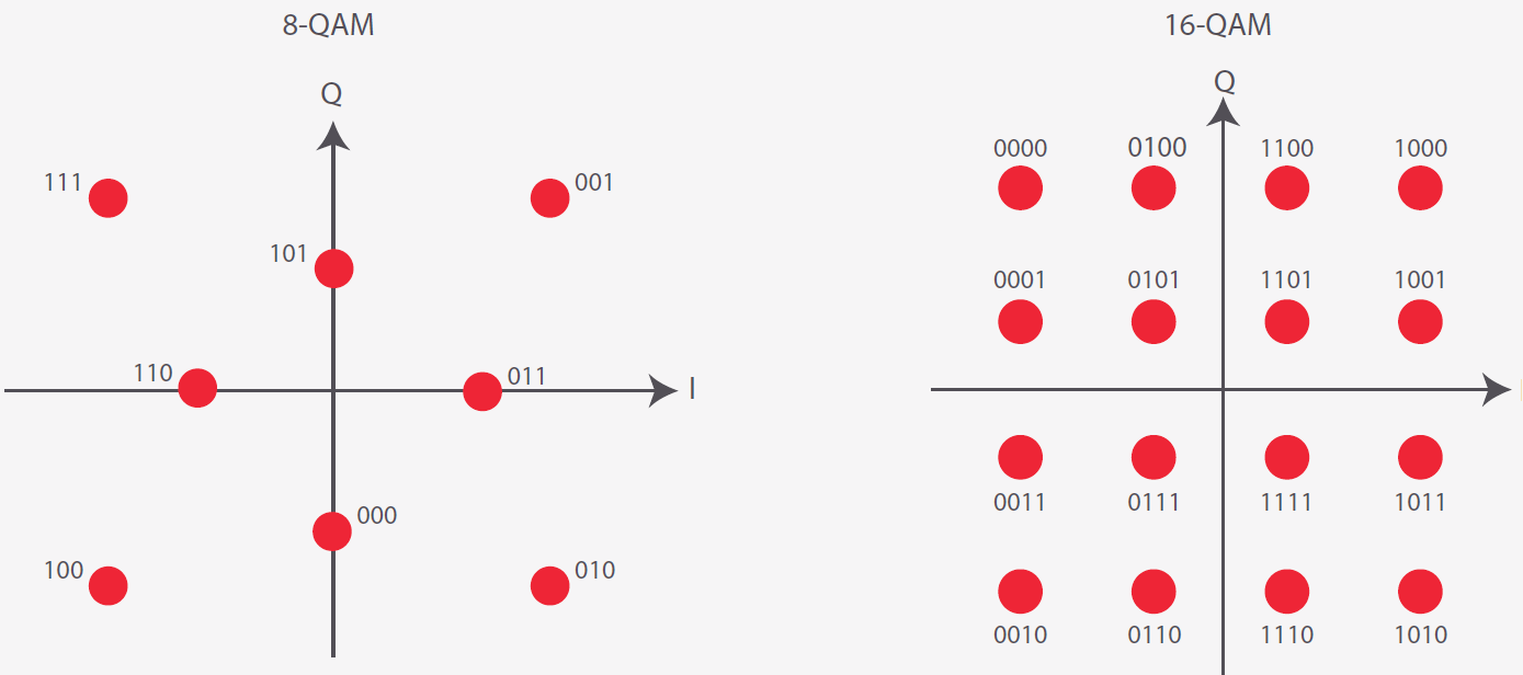 在光纤中,APSK 可应用到非线性噪声场景中,用于改善对非线性光纤特征的容忍度。当数据速率高达400 Gbps 及以上时,16-QAM 的星座点间距较大,更易实施且光信噪比性能更佳,因而是首选的方案。