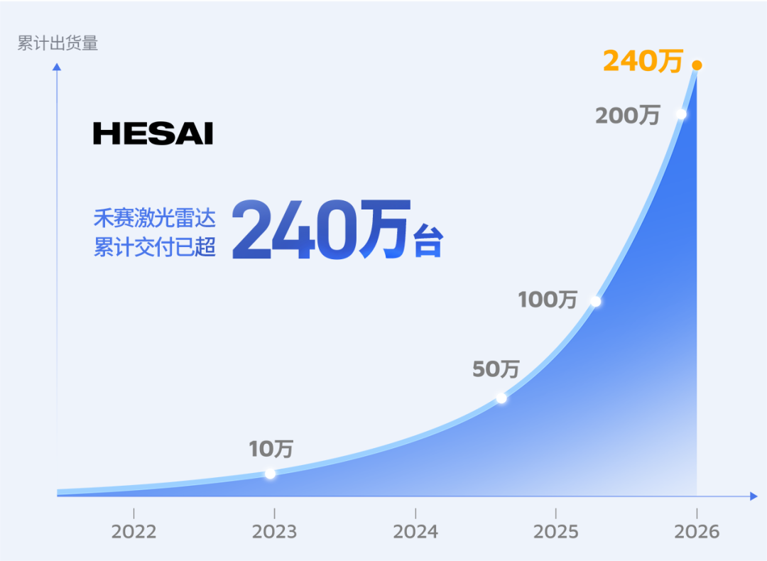 禾赛已连续五年全年交付量翻番。2025 年,禾赛全年交付量超 160 万台,单月最高交付量超 20 万台,ADAS 产品全年交付量约 140 万台,机器人产品全年交付量超 20 万台,ATX 开启交付首年即突破 100 万台,全系激光雷达产品历史累计交付量已超 240 万台。