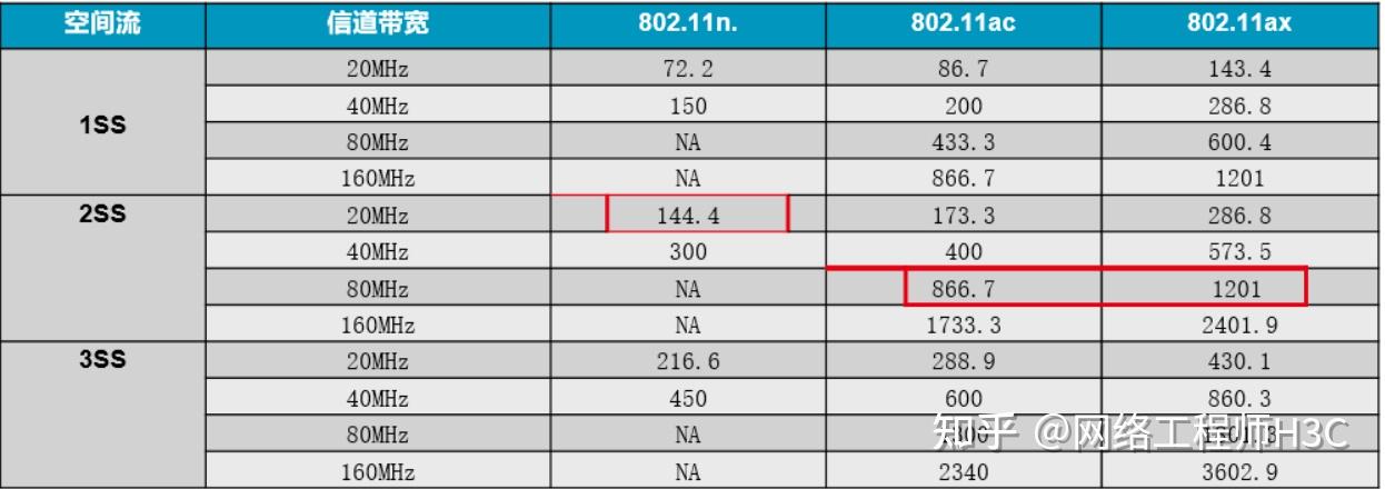 其中,AP最大协商速率与带宽和空间流数量相关,具体情况如下表: