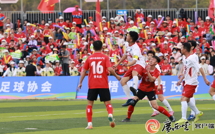 双方队员头球争顶。潘绍珊 摄来自石桥镇本地的球迷潘应聚嗓子早已喊得沙哑。“我还是第一次近距离看这么高规格的足球比赛,这场球看得过瘾,两队拼得都凶,比平时在电视上看激动多了,希望我们六堡茶队可以赢得胜利!”带着孩子来观赛的家长车艳明说道:“孩子平时就喜欢踢足球,今天带他来现场感受氛围,看着球员们拼搏的样子,他特别激动,还说以后也要参加这样的比赛。这样的赛事能点燃孩子们的足球梦,特别有意义。”