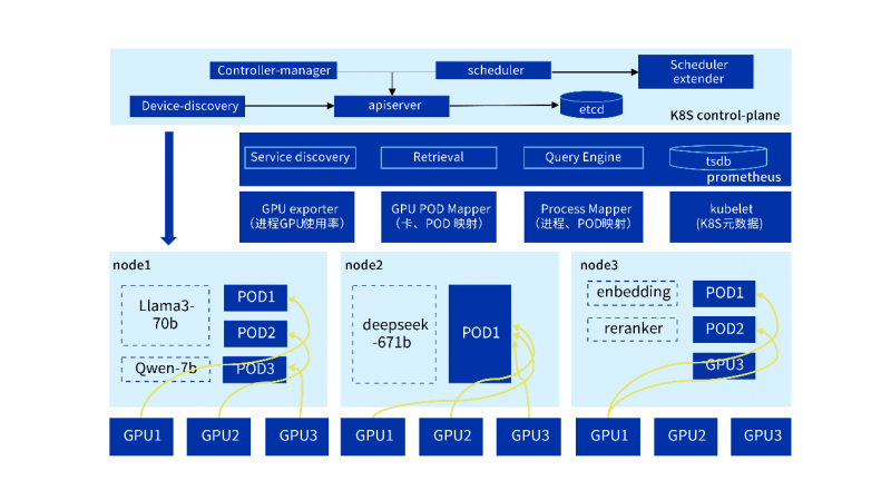 例如,在多GPU节点集群中,系统可能同时运行Llama3-70b、Qwen-7b、DeepSeek-671b 等不同规模大模型,以及embedding、reranker等辅助模型,通过精细调度将Pod与指定 GPU绑定——这种复杂部署下,传统工具无法定位单个Pod的资源占用情况,给多租户计费、故障排查、性能优化带来巨大挑战。