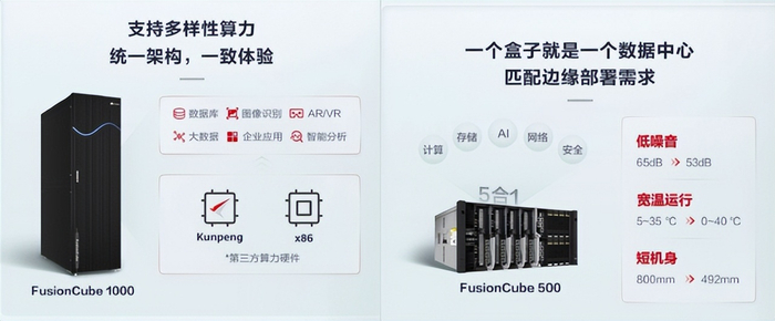 在硬件层面,华为FusionCube超融合产品实现从中心到边缘,从单一算力到多样算力的能力提升。比如,发布会上,华为推出的新一代FusionCube 1000,在原有性能基础上,可满足市场对多样性算力的需求,并通过架构同源、软硬协同优化,实现完全一致的体验,将性能提升20%。