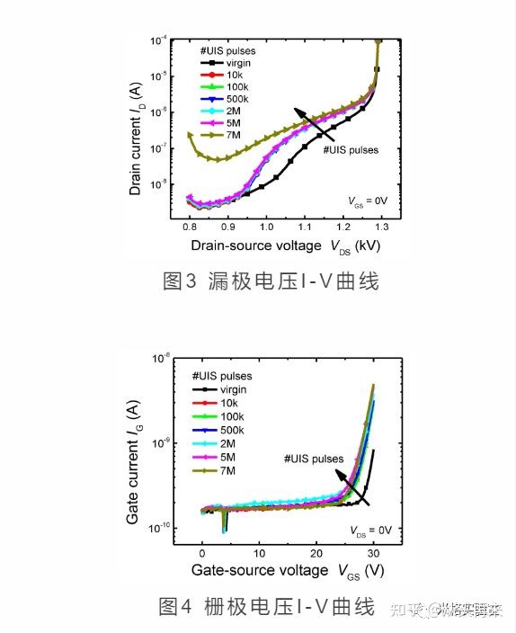 重复UIS脉冲引起阈值电压有轻微的漂移,同时导致了通态电阻的下降,这在输出特性中很明显。通态电阻的降低标明特性不受热循环的影响。