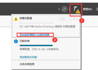 打开vm web右上角叹号,点击“将此服务器提升为域控服务器”;