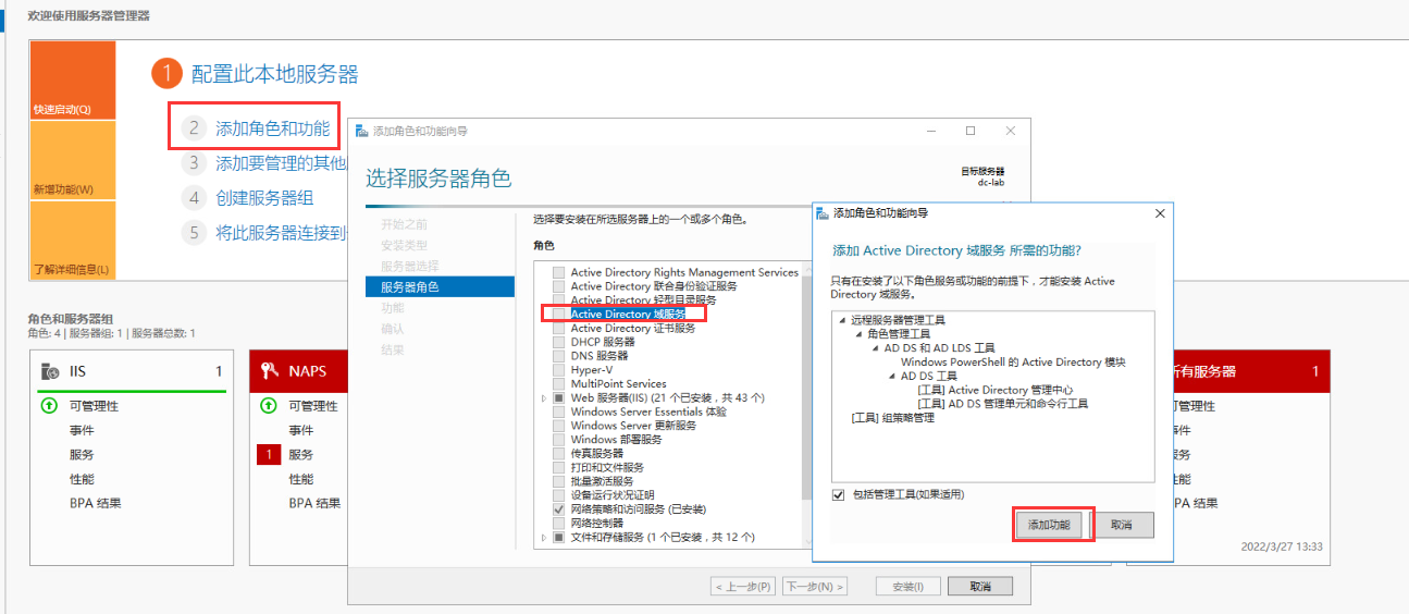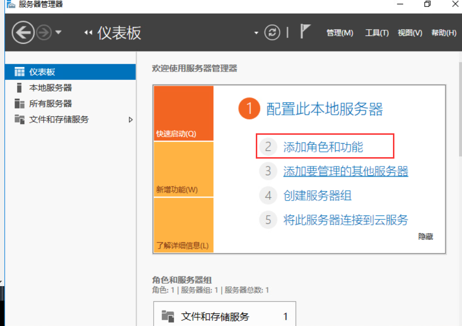 重启后重新连接远程桌面,在服务器管理器里添加角色和功能,安装ad域服务;