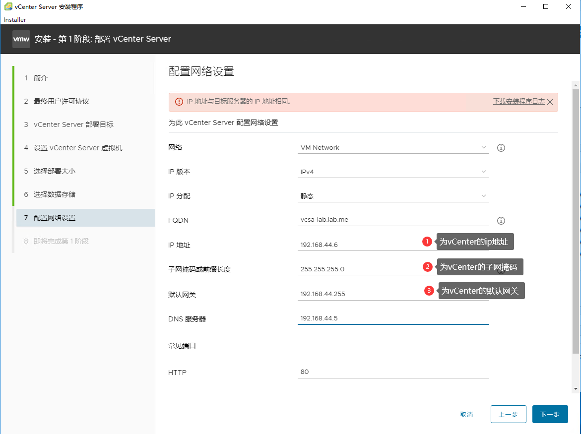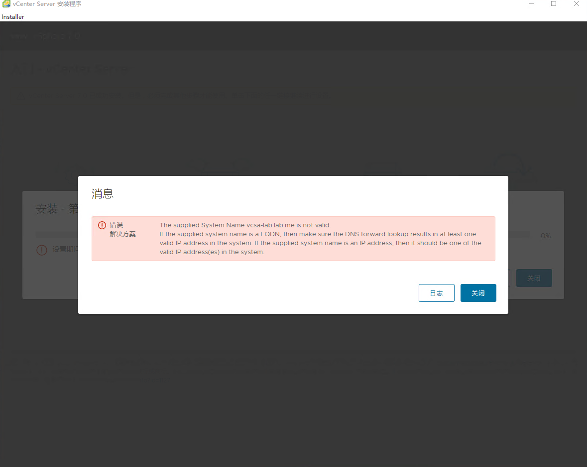 注意:并且dns正向解析记录这个ip地址一定不能填错,否则第二阶段进度条会卡住,最后会提示报错。这里报错的dns正向解析新添加的主机是192.168.44.3。(报错译文: 提供的系统名称vcsa-lab.lab。我是无效的。如果提供的系统名是FQDN,那么请确保DNS正向查找在系统中至少产生一个有效的IP地址。如果提供的系统名是一个IP地址,那么它应该是系统中有效的IP地址之一);