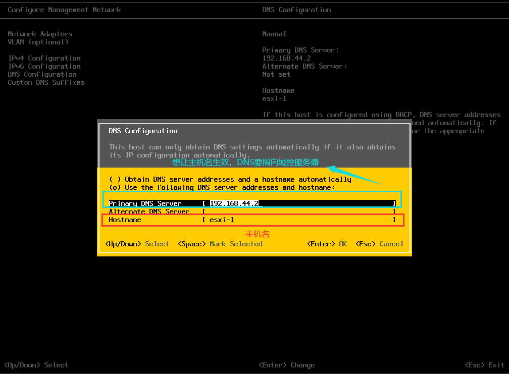 F2设置configure management network(网络配置)--DNS configuration(DNS配置);