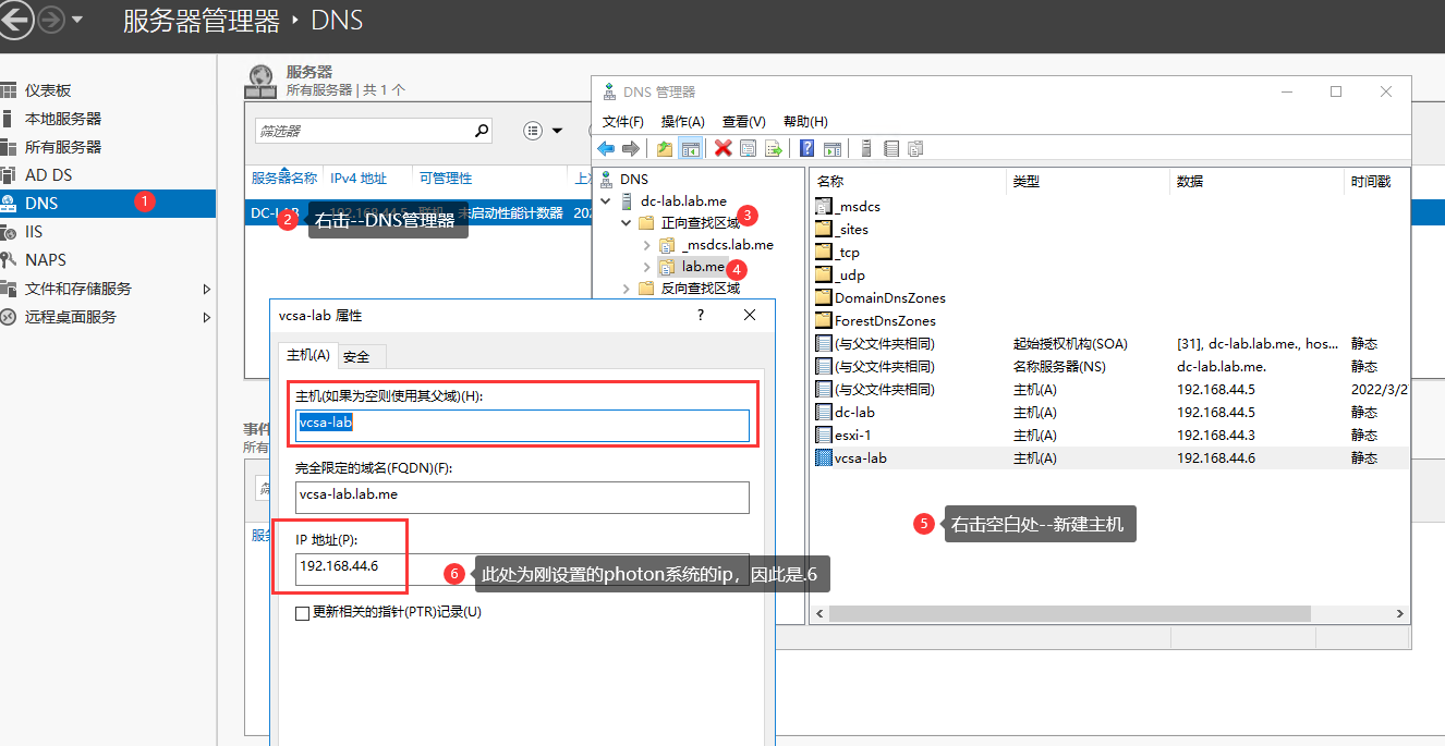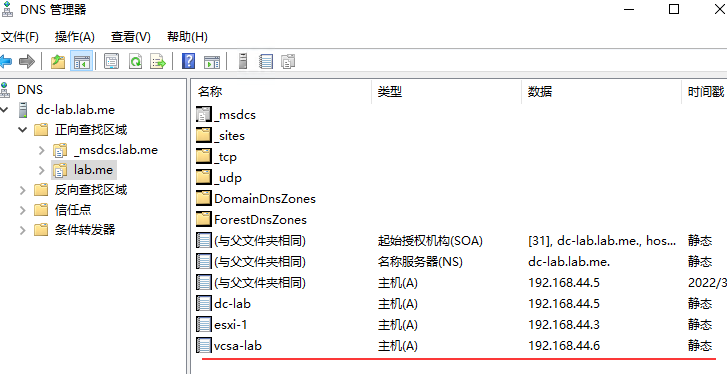 DNS新建一个vcsa-lab主机;所以,dns服器要添加对应的正向解析记录,并且aot的网络配置里dns得填域控服器;