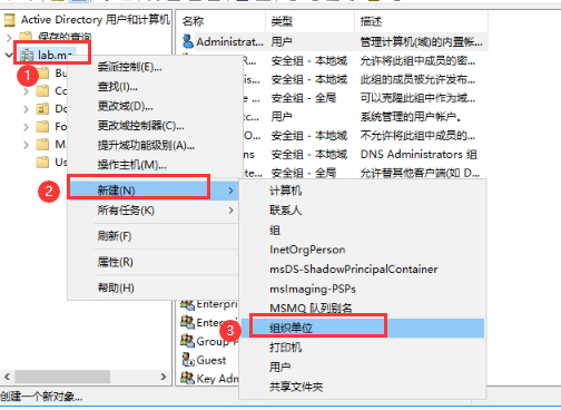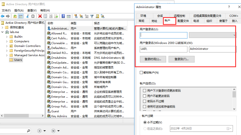 重启完成刚才的虚拟机,就成为了域控服务器这个时候在登录Windows就得用域账户(DC-LAB\administrator),LAB\administrator登录了。用户名这里正常来讲你不用操心,默认都是正确用户名,我只是因为远程的账户记录里是错的,万一你真进不去,在web端登录,在AD域管理器上右键,选择ad用户和计算机;