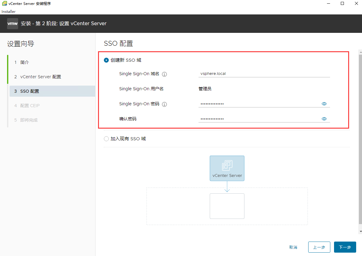SSO可以不用创建,用本机默认的域就行。这个域和用户名密码一定要记住,这是你vSphere Client管理平台的默认登录账户;