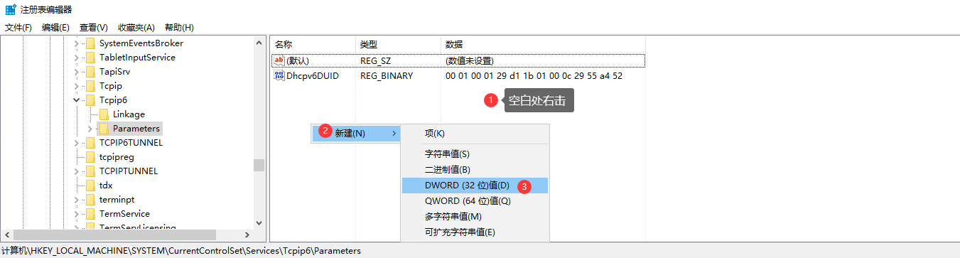 找到:HKEY_LOCAL_MACHINE\SYSTEM\CurrentControlSet\Services\Tcpip6\Parameters