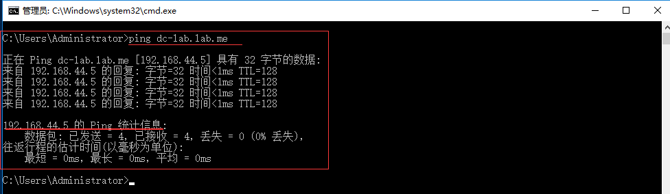 我们测试一下效果,cmd管理器键入:ping http://dc-lab.lab.me直接ping下能返回结果,说明解析成功了;