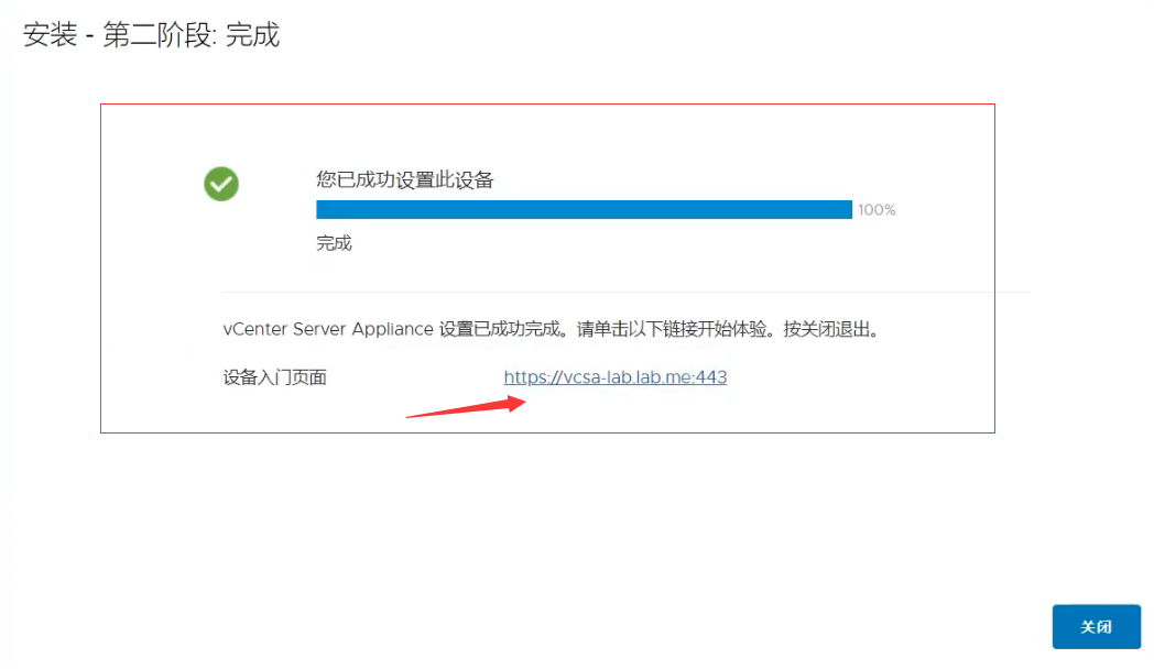 等待缓慢的安装,这里显示安装完成后设备入门页面地址:https://vcsa-lab.lab.me:443
