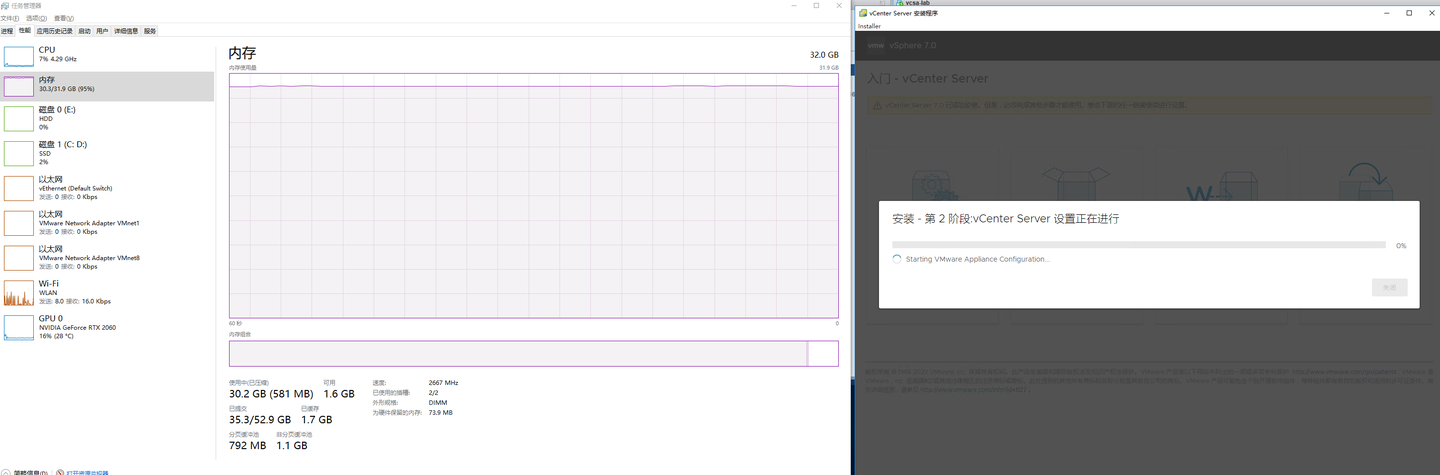 注意:宿主机可以看到,第二阶段安装过程中32G内存时刻处于即将爆掉状态,不过不用担心,只要设置了FQDN并添加DNS正向解析记录的ip是可以正常安装没问题的;