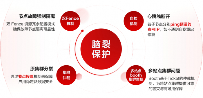 为防范因集群节点间心跳故障时信息无法同步所引发的数据不一致风险及相关损失,银河麒麟高可用集群软件V11提供了全面加固的心跳机制与脑裂保护策略。该方案最高支持7路网络心跳+1路磁盘心跳,当网络心跳异常时,可自动切换至磁盘心跳维持集群通信,确保节点间状态持续同步。在此基础上,系统引入双Fence机制与Booth票选决策机制等多重仲裁手段有效处理脑裂问题,显著增强了集群的故障隔离与自愈能力,从而在复杂环境下极大保障了业务的高可用性与数据一致性。