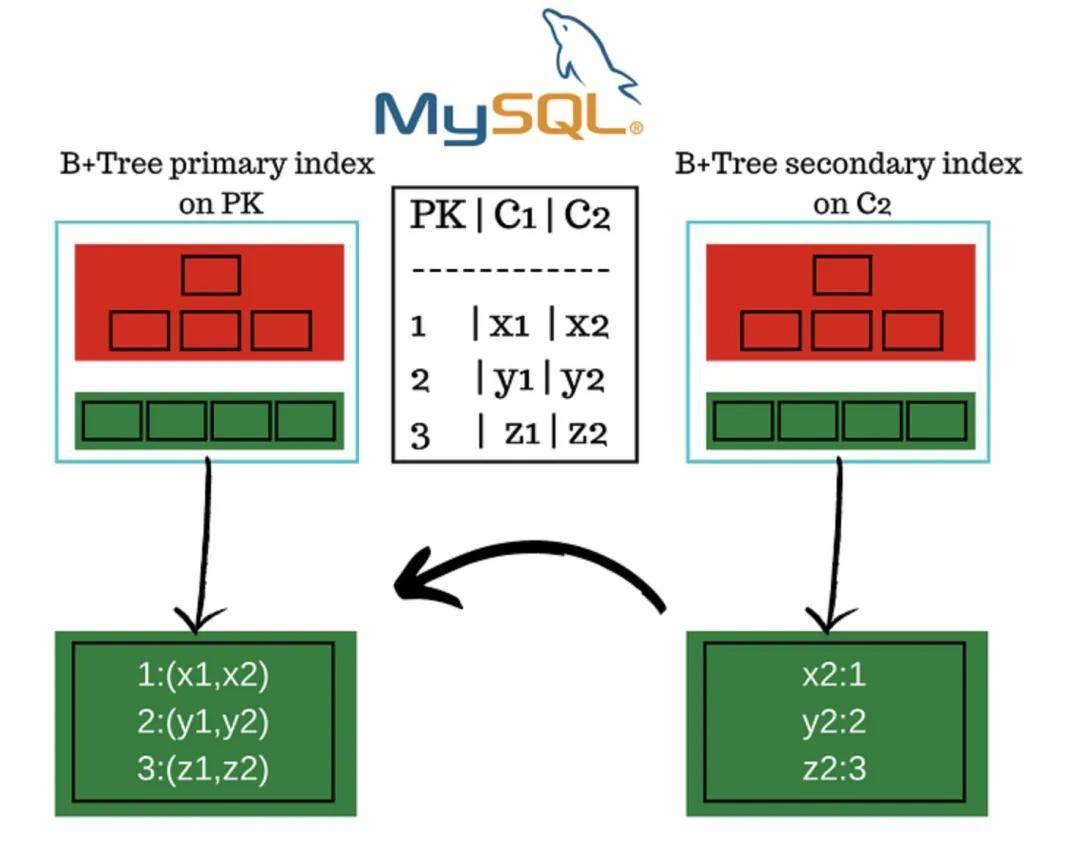 # 主键列 PK 上有主索引,C2 列上有二级索引,C1 没有索引;