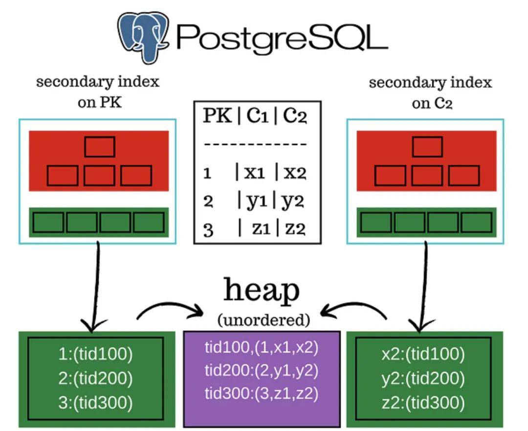 在 Postgres 中,从技术上讲并没有“主键索引”的概念,所有索引本质上都是二级索引。它们都指向系统管理的 tuple ID(元组 ID),根据这些 ID 再定位到实际存储在堆中的数据页。需要注意的是,堆中的表数据是无序的,并不像聚簇索引的叶子节点那样按键值顺序排列。