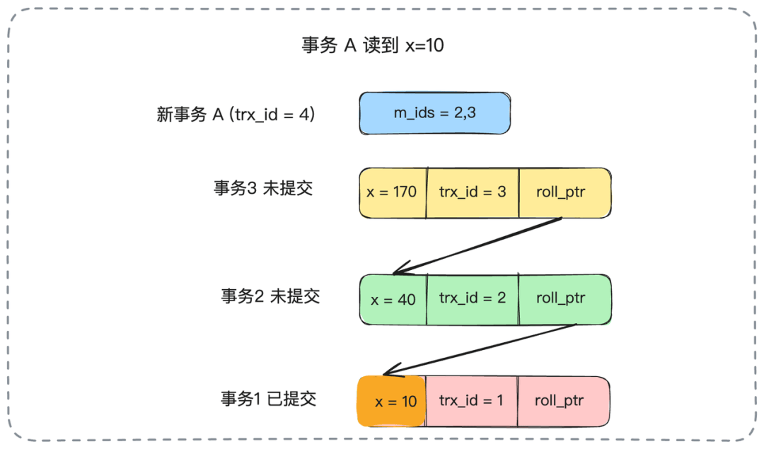 现在,一个新的事务A(trx_id为4)启动了。当它第一次查询x的值时,MySQL会创建一个Read View。此时,活跃(未提交)的事务ID集合是m_ids = {2, 3}。事务A会沿着版本链从最新版本开始查找,它会跳过trx_id为3和2的版本(因为它们的事务ID在活跃事务列表m_ids中,意味着它们是“未提交”或“并发”的事务),最终找到trx_id为1的版本。这个版本已经提交,所以事务A读到的x的值是10。