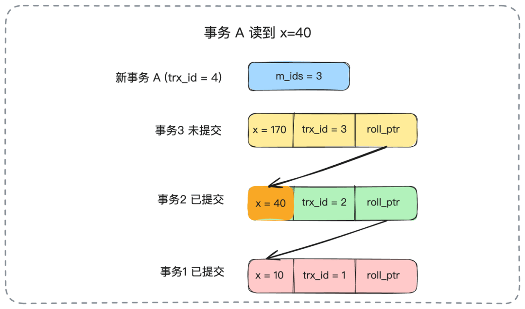 紧接着,事务2提交了。然后事务A在同一个事务内再次查询x。由于是RC隔离级别,MySQL会重新生成一个Read View。此时,活跃事务列表变成了m_ids = {3}。事务A再次沿着版本链查找,它会跳过trx_id为3的版本,但当它检查到trx_id为2的版本时,发现2已经不在新的活跃列表m_ids中了(意味着事务2已提交),于是它读取了这个版本的数据。因此,事务A这次读到的x的值是40。这就是“不可重复读”的由来。