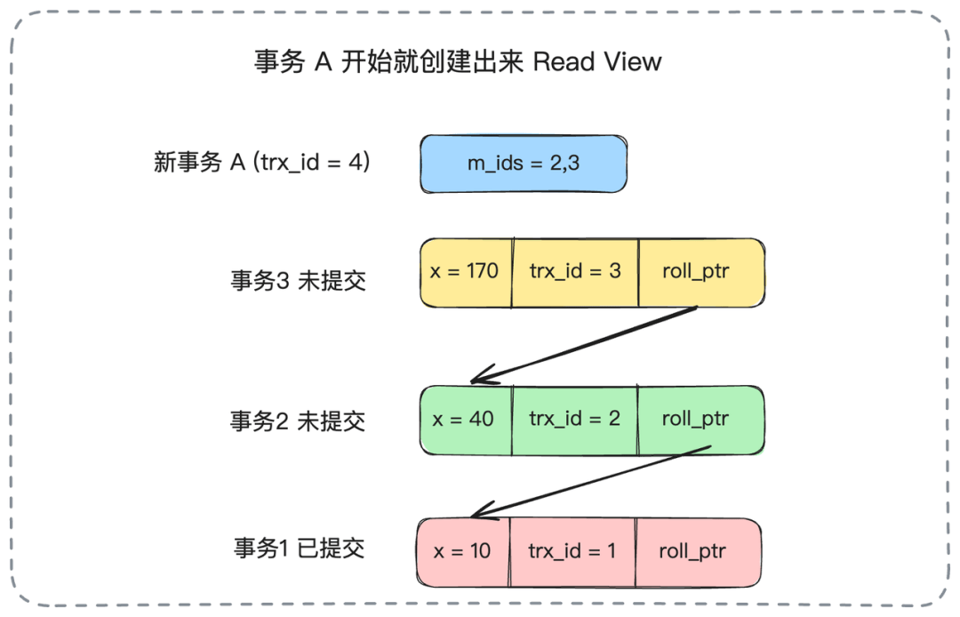 接下来,即使事务2提交了,当事务A再次查询x的值时,它使用的仍然是事务开始时创建的那个旧的Read View。在这个旧的Read View中,m_ids依然是{2, 3}。所以,对于事务A来说,事务2看起来仍然是“未提交”的(因为事务2的ID存在于它持有的那个旧的Read View的m_ids列表中)。因此,它会再次忽略trx_id为2的版本,最终读到的结果仍然是x=10。