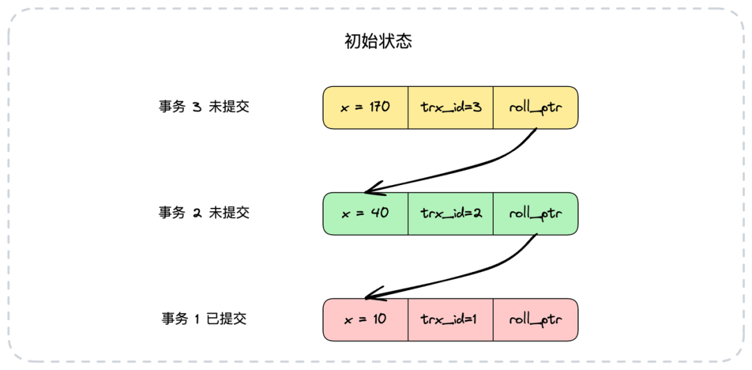 这样一来,通过roll_ptr,一行数据的多个历史版本就被从新到旧地串联成了一条链表。这条链就是大名鼎鼎的版本链。