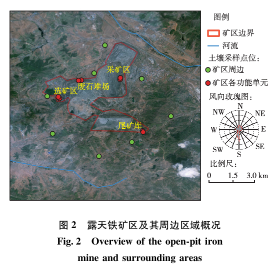 以露天铁矿区及其周边0~5km区域作为土壤采样调查区域,考虑污染样点代表性、可达性及关键筛查区域,在露天铁矿区内各功能单元(如采矿区、选矿区、废石场、办公区)和矿区外围(上风向、下风向及侧向农田)依据HJ/T 166—2004《土壤环境监测技术规范》布设16个采样点(图2),选择0~20cm表层土(大多数污染物主要累积在此层,且表层是土壤生态受体最集中、最活跃的栖息地与暴露界面,因此最能表征其对生态系统的潜在风险)进行采样,6种重金属按照GB 15618—2018《土壤环境质量农用地土壤污染风险管控标准(试行)》进行检测。