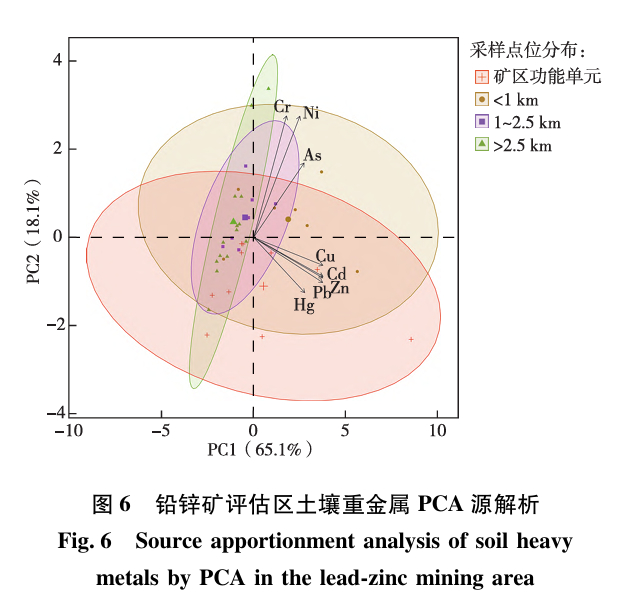 PCA源解析结果(图 6)表明,As、Cd、Cr、Cu、Hg、Ni、Pb和Zn 8种重金属可提取2个特征值>1的主成分,对第一主成分(PC1)载荷较高的重金属为Pb、Cd、Cu、Zn和Hg,这些元素的变异系数在矿区内较高(0.86~1.32,表 2),且距离矿区[14],PC1主要与矿业活动密切相关,受采矿、选矿及运输等活动的直接影响较显著。对第二主成分(PC2)载荷较高的重金属为As、Cr和Ni,这些元素的变异系数在矿区内外变化不大(表 2),主要与区域自然成土过程有关。在距离矿区>2.5 km的区域,采样点多沿PC2方向分布,说明随着距离增加,矿业活动干扰逐渐减弱,土壤重金属含量更多受自然背景因素控制。综上,污染物空间分析和源解析可以初步筛选Pb、Cd、Cu、Zn和Hg为矿区优先管控污染物。