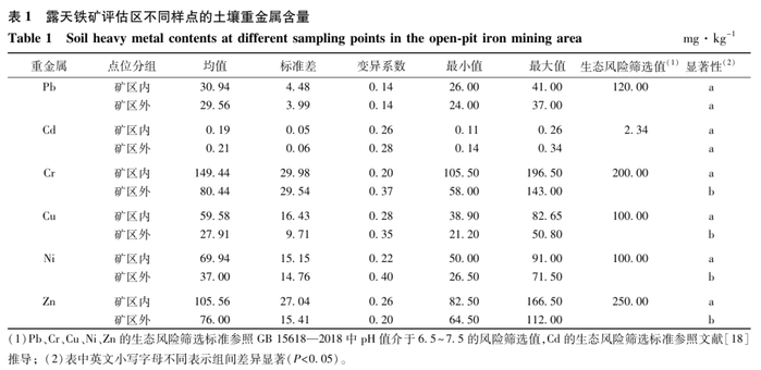 表 1为露天铁矿区及其周边不同点位分组的土壤重金属含量。