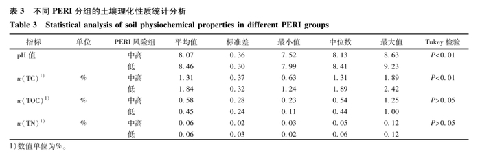 不同PERI组土壤pH值及TOC、TC、TN含量(表 3)结果表明,土壤pH值和TC含量受到重金属污染的显著影响。PERI中高风险组pH平均值较低风险组降低了0.39,土壤TC平均含量也显著降低近30%,而TOC与TN含量无显著变化。这主要是因为矿区位于典型碱性土壤环境区,且土壤碳酸盐含量较高[24],矿区排放的重金属以及伴生硫化物进入土壤后会发生水解产生氢离子,进而导致土壤酸化,溶解碳酸盐,降低土壤pH值和TC含量,类似情况在我国西藏拉屋矿区也有报告[25]。