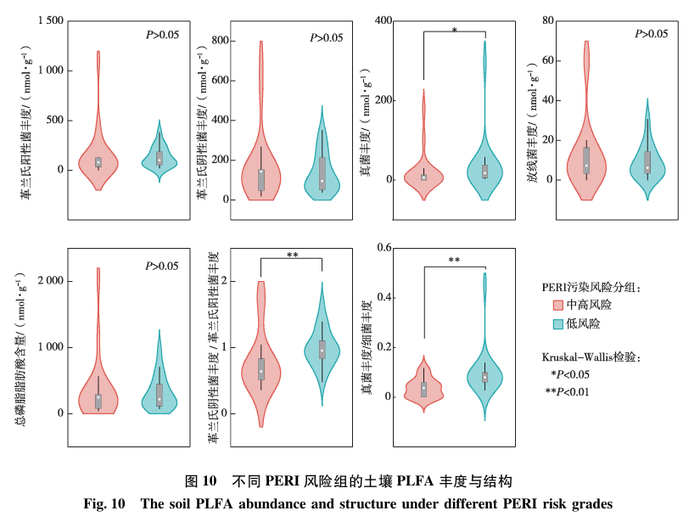 采用ANOVA比较不同PERI风险水平的土壤性质与PLFA丰度和结构的差异;采用Spearman、Mantel检验探讨不同环境变量与PLFA效应之间的相关性;利用结构方程模型(SEM)确定重金属生态风险对土壤PLFA丰度和结构的直接和间接影响,相关统计分析通过R软件(http://www.Rproject.org)实现。