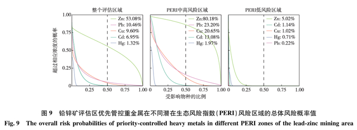 以不同PERI风险等级对样点进行分组,建立不同风险区的土壤Pb、Cd、Cu、Zn、Hg联合概率曲线(JPCs),计算相应的总体风险概率值(ORP)(图 9)。在整个调查区域内,Zn对当地土壤生态系统构成高概率风险,Pb属于中概率风险,Cu和Cd属于低概率风险,Hg概率生态风险可忽略。在PERI中高风险区中,Zn和Pb的概率风险等级不变,而Cu、Cd和Hg均上升1个风险等级;在PERI低风险区中,除Zn属于低概率风险外,Pb、Cd、Cu和Hg 4种重金属的概率风险均可忽略。铅锌矿评估区潜在生态风险的污染物优先控制顺序是Zn>Pb>Cu>Cd,这4种污染物存在中高概率生态风险,Hg风险因其ORP较低(Pb>Hg>Cu>Zn)有所差别,主要是PERI风险指数和概率风险表征方法之间的区别:PERI指数高度依赖于污染物的背景浓度和毒性响应系数,且该层概率风险评估获得的ORP进一步融合了铅锌矿评估区内各污染物的实际暴露浓度分布与物种敏感度分布,更能反映其对当地生态系统的综合实际风险。