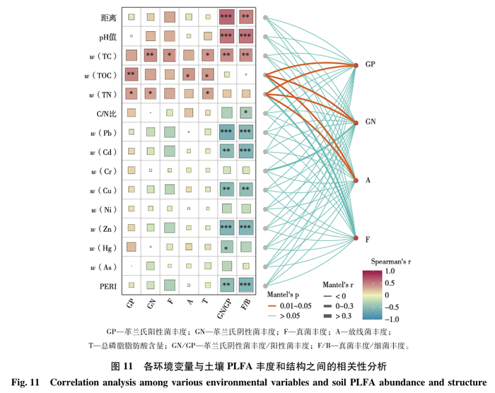 将土壤PLFA与土壤理化性质、重金属等环境因子进行相关性分析(图 11),结果显示土壤PLFA丰度与土壤TOC、TC和TN含量呈显著正相关,与重金属含量相关性不显著。PLFA丰度与结构则与Pb、Zn、Cd、Hg、Cu含量和PERI指数呈显著负相关,与土壤pH值、TC含量以及距矿区距离呈显著正相关。因此,重金属含量对土壤中各类PLFA丰度没有显著影响,但可以改变PLFA结构,而土壤TOC和TN作为微生物生长的直接营养来源对PLFA丰度起关键作用。