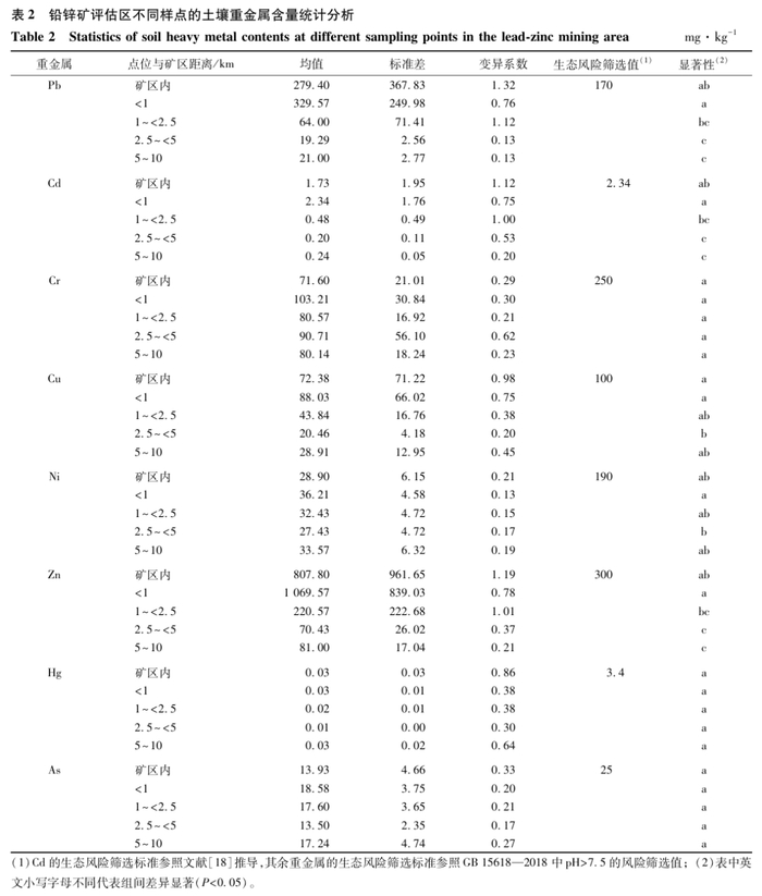 表 2列出了铅锌矿评估区不同分组的土壤重金属含量。土壤Pb、Cd、Cu、Zn和Hg含量在距离矿区1km内的变异系数均超过0.5,说明可能受到采矿活动影响。此外,随着采样点位与铅锌矿区之间距离的增加,土壤Pb、Cd、Cu和Zn含量显著下降,到2.5km之外各组之间没有显著差异。