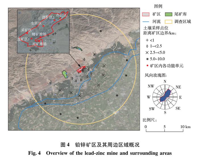 依据上层(风险关联识别层)信息,以铅锌矿区场地为中心向外扩延10km作为评估区,在矿区不同功能单元和矿区距离梯度设置38个土壤表层点位(图4)。具体采样布点原则、重金属检测方法与2.2节相同。