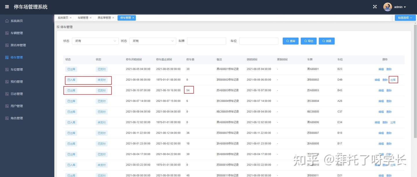 车辆入库后会生成一条停车记录,此时状态是已入库和未支付,等车辆出口后,系统会根据车位的每小时停车费*实际停车实际(按小时计算,超出一小时按一小时收费)。这里大家需要注意,真实的停车场收费都是摄像头拍照的,比如车子出库的时候,摄像头会拍摄车牌,然后生成收费信息,当你缴费后就可以出库了。这里我们是管理后台,系统并没有接入摄像头设备,所以出库需要人工点击出库按钮。(也可以接入支付宝扣费接口和摄像头接口,这样我们的系统就跟真实的停车管理系统一样了~)