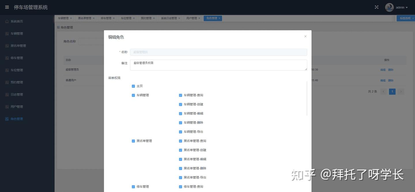 系统默认会创建两个角色,一个是超管角色,另一个则是普通用户角色(当然角色大家可以按前面说的自定义)。普通用户登录,比如停车管理菜单,普通用户就只有查询的权限,其他的新增、编辑、删除、导出和出库权限都没有。截图如下: